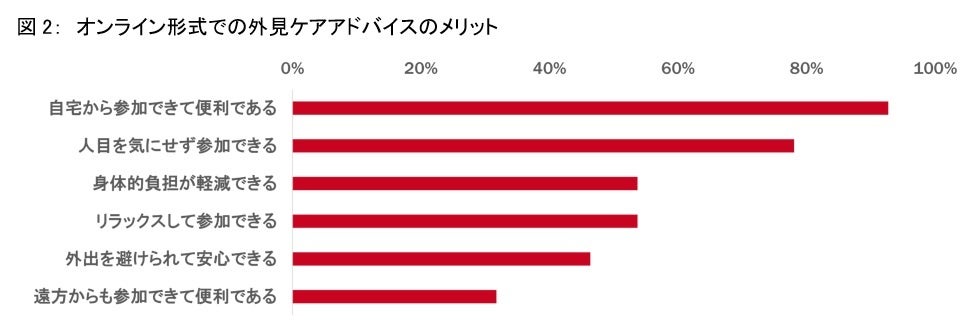 一方、オンライン形式での相談に関しては、80.5%が「抵抗感がない」と感じていました。オンライン形式での外見ケアアドバイスのメリット(複数回答)として、「自宅から参加できて便利である(94.7%)」、「人目を気にせず参加できる(76.3%)」、「身体的負担が軽減できる(57.9%)」などが挙げられました(図2)。また、オンラインでのアドバイスを通じて、悩みの解決につながったことが確認されました。