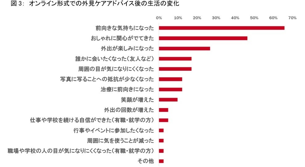 オンライン形式での外見ケアアドバイス後、1週間患者自身で実践した後の日常生活面での変化(複数回答)については、「前向きな気持ちになった(65.7%)」、「おしゃれに関心がでてきた(44.7%)」「外出が楽しみになった(26.9%)」など、さまざまな気持ちや行動の変化がありました(図3)。