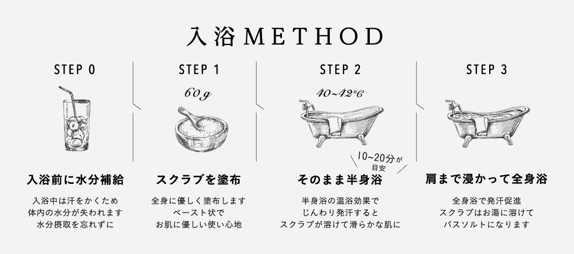 体に塗ったボディスクラブは、お湯に溶けてバスソルトへと早変わり。肩まで浸かることで温浴効果が促進し、さらなる発汗を促します。