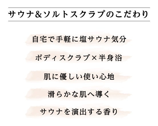 スクラブを全身に塗ってから半身浴をすることで、まるで塩サウナに入った後のようなしっとりと滑らかな肌に。10〜20分ほどしたら、そのまま全身浴へ。