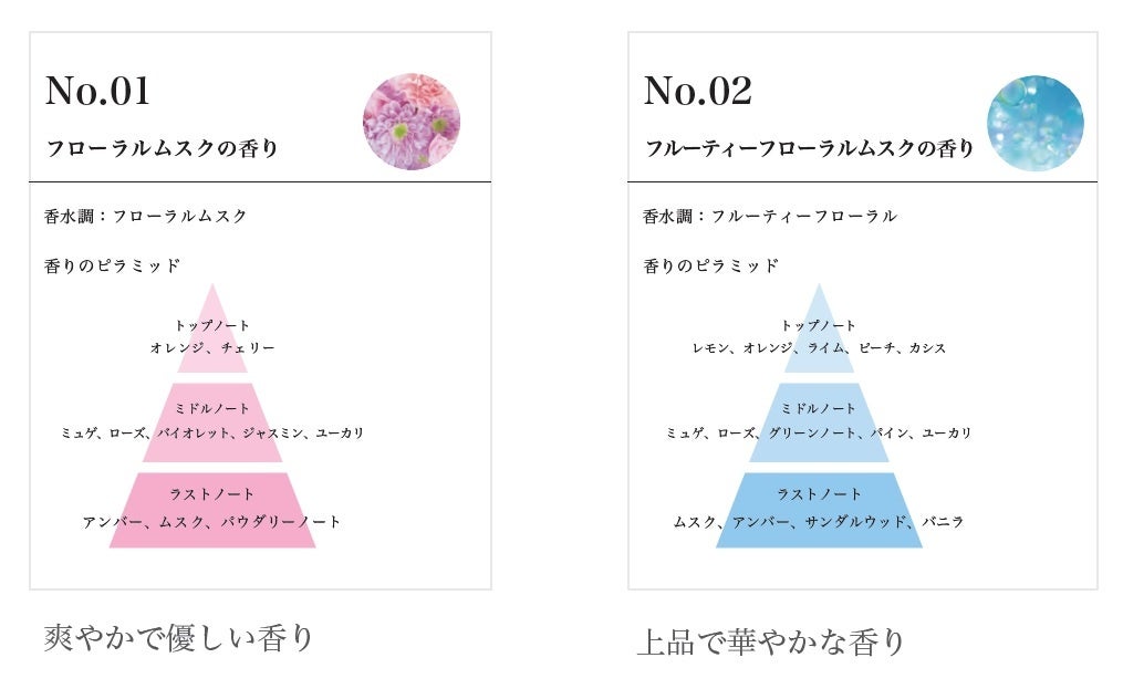 爽やかで優しいフローラルムスクの香りと、上品で華やかなフルーティーフローラルムスクの香りの2種類から選ぶことができます。