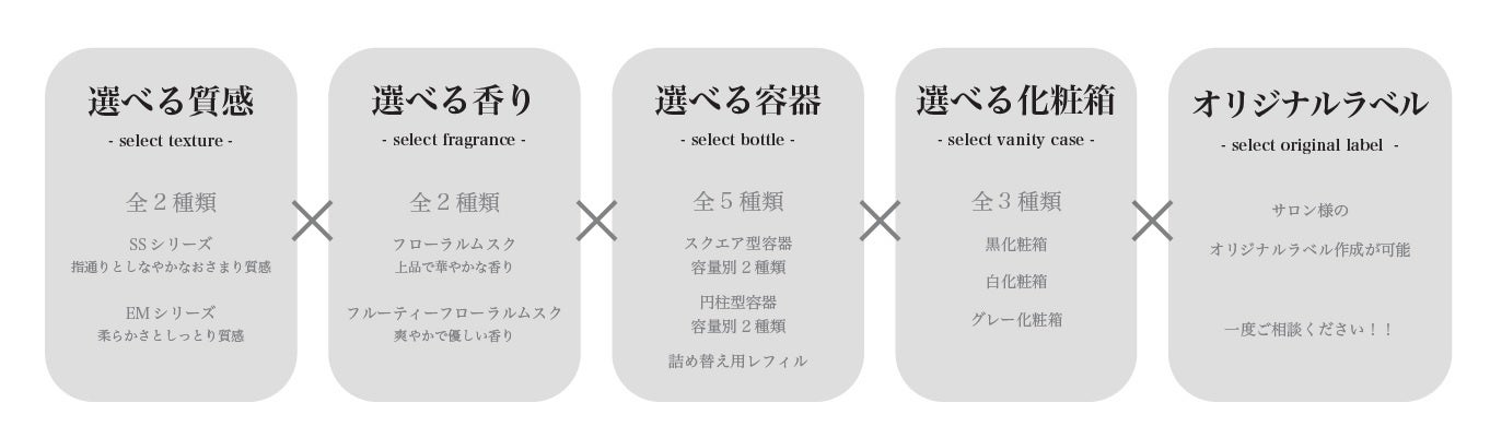 質感、香り、容器、化粧箱、ラベルは自由にカスタマイズ可能