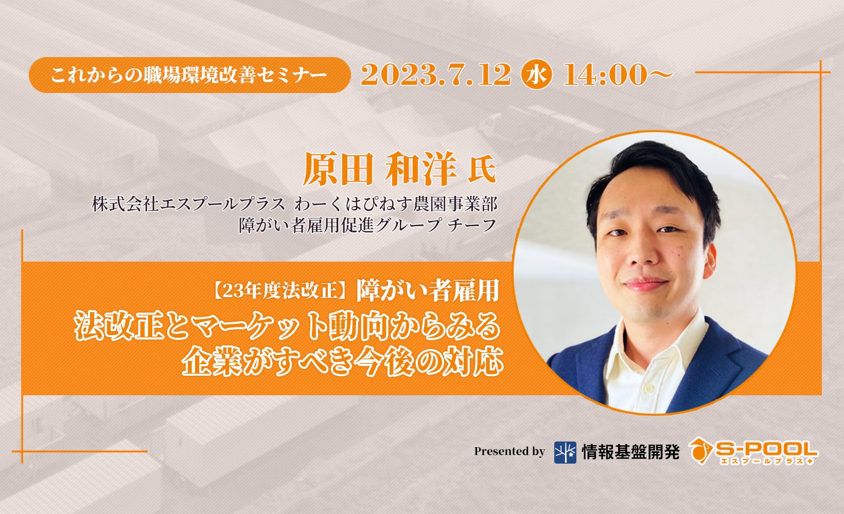 今回、このような社会的背景を踏まえ、障がい者雇用に「本腰入れて雇用方針を立てていきたい」と相談を受けることも多いというエスプールプラスの原田和洋氏を講師に招いた “これからの職場環境改善”セミナーを開催します。