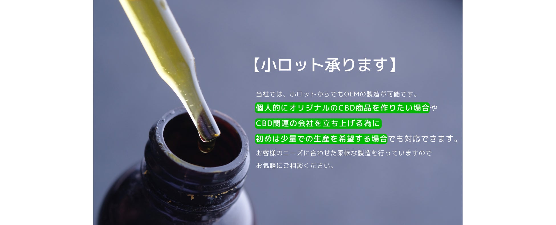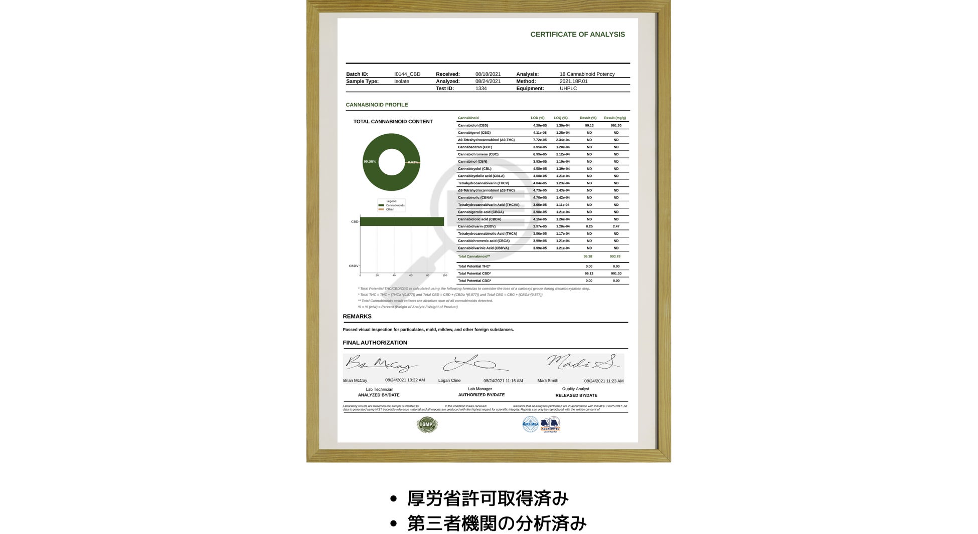 当社の商品は厚生労働省から認可を受けたCBDのみを使用しています。品質管理はもちろんのこと、納品後のアフターケアも担当者が行っていますので、安心してご使用いただけます。また、成分表・入管書等のご提供もさせていただきます。