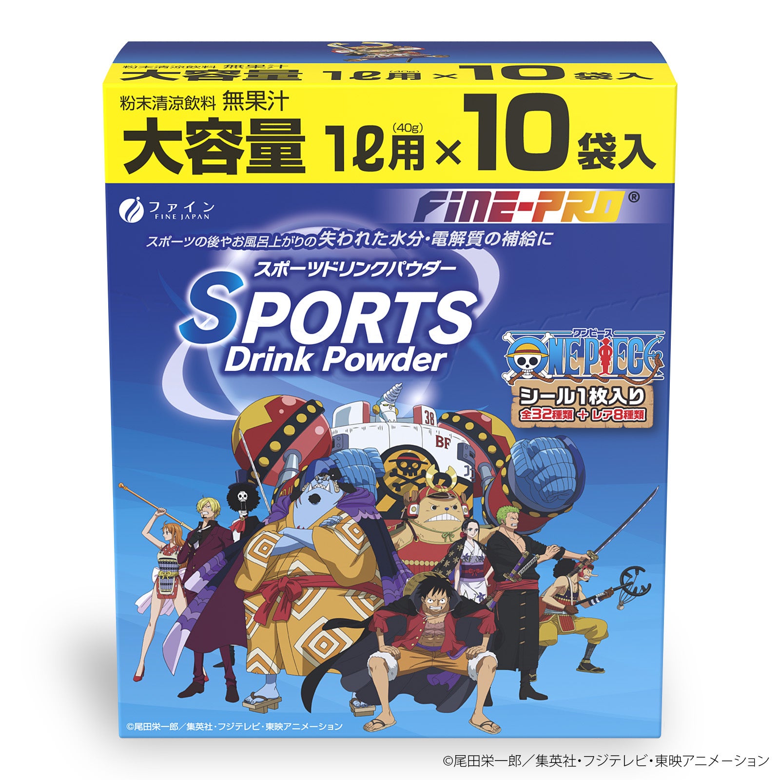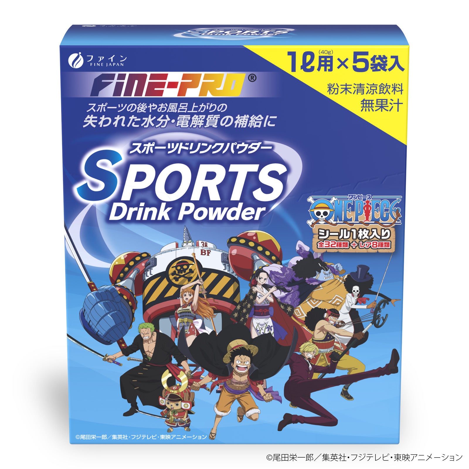 健康食品及び医薬品などを製造・販売する株式会社ファイン(本社:大阪市淀川区、代表取締役:佐々木 信綱)は、国民的アニメ『ONE PIECE』と「スポーツドリンクパウダー」のコラボレーションを実施。「スポーツドリンクパウダー」の5袋入りと10袋入りを、2023年7月1日(土)より販売開始いたします。各商品には、『ONE PIECE』の人気キャラクターが描かれた限定イラストシールが、スポーツドリンクパウダー史上最多のバリエーションとなる全40種類(通常32種類+レア8種類)のうちランダムで一枚ずつおまけで封入されます。