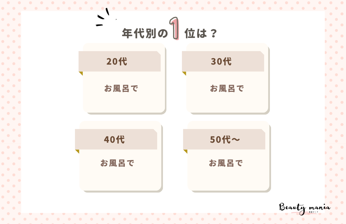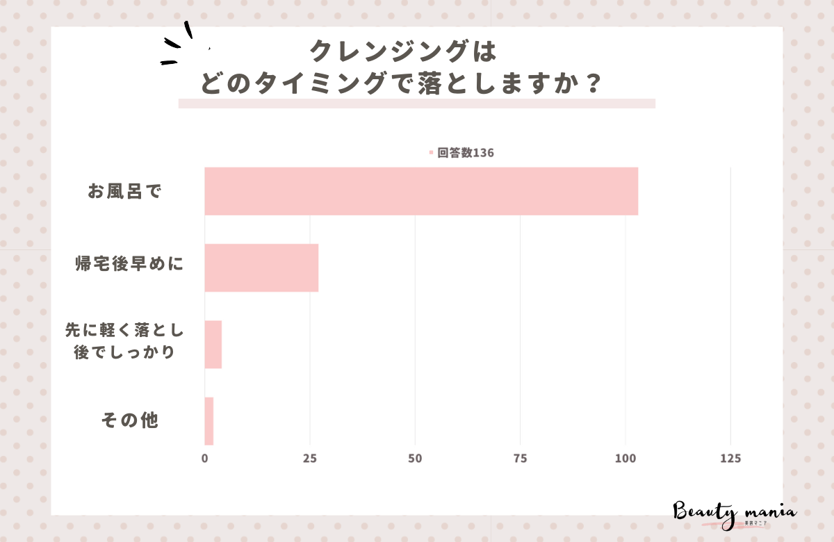 アンケート内容: クレンジングはどのタイミングで落としますか?帰宅後早めに?お風呂?
