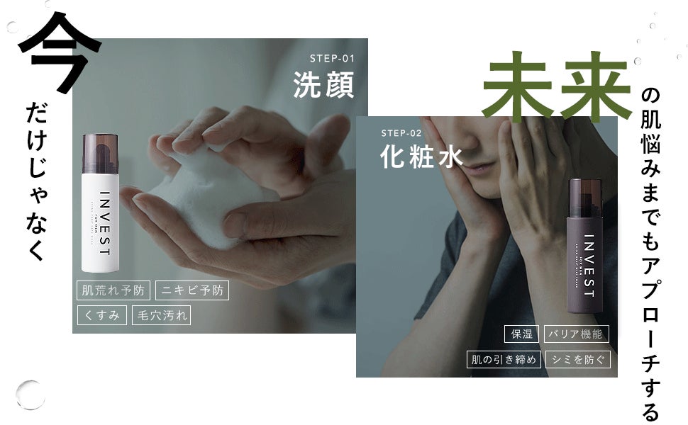 つまりテカリ安く乾燥しやすいストレスの多い肌環境。 さらに加齢により潤いは年齢を重ねるごとにどんどん減少するためバリア機能が低下し、シワやシミ、くすみが出やすい肌に変わっていきます。 そこでINVESTは今も未来もかっこよく歳を重ねるために、”今”のスキンケアと”未来”に向けたエイジングケア”を同時に行うことが重要であるという考えのもと、 新コンセプトである「年齢に負けない肌を手に入れる」を掲げました。