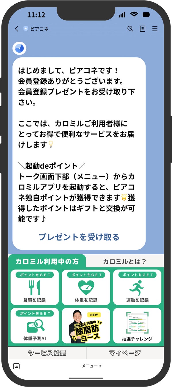 今回のリリース第一弾では、健康をテーマとし、快適な生活が送れるような運動/食事/睡眠などの各種サービスが提供され、当社は食事をはじめとした健康管理において連携します。より長く継続して食事記録をつけて、健康につなげていただきたいという想いから、ピアコネLINE公式アカウント経由でカロミルを利用いただくと、ピアコネのポイントが付与されます。