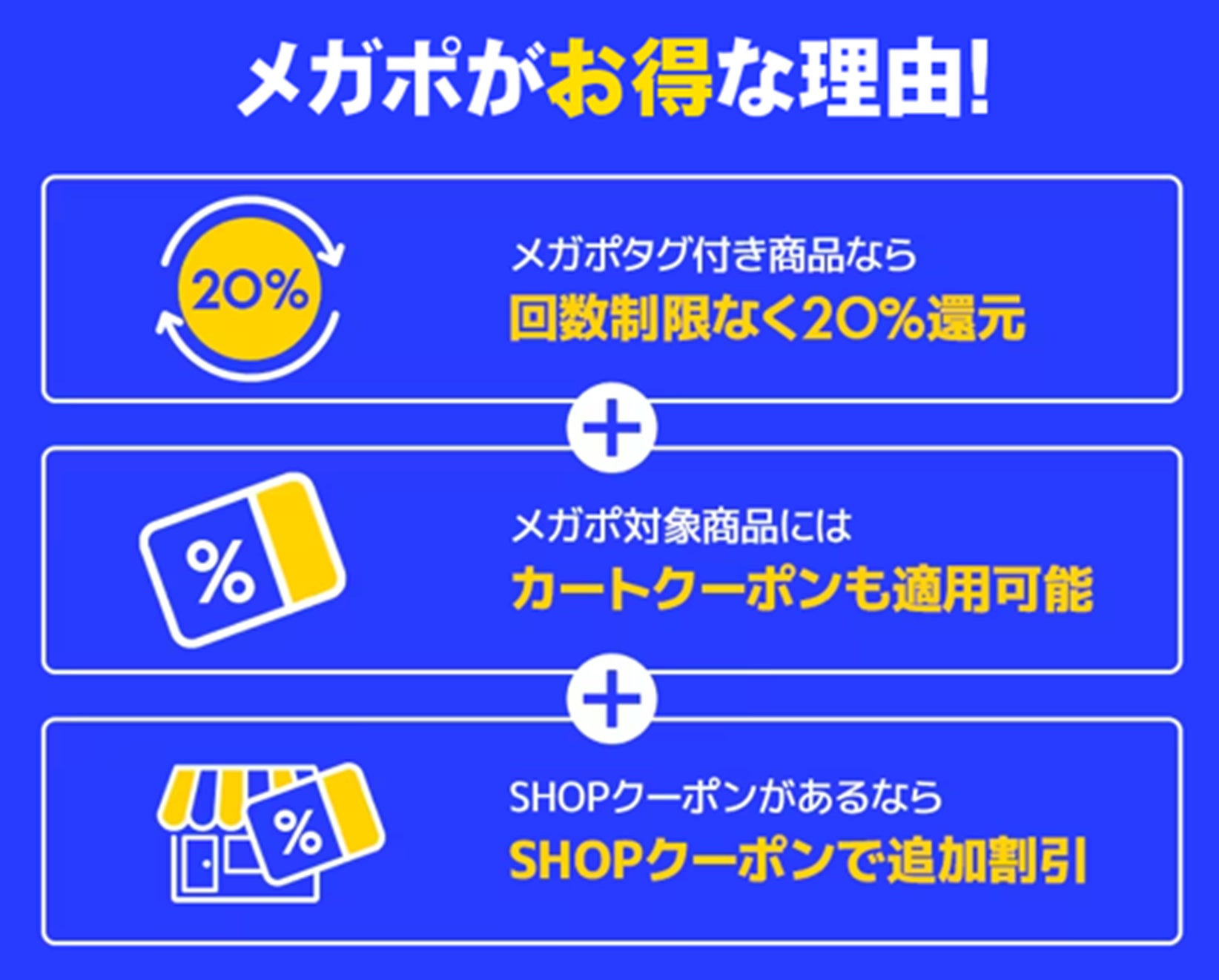 ポイント還元が受けられる「高還元商品」、メガポ限定の特価商品を集めた「メガポ特価」、5%や500円以上などのオリジナルクーポンを発行するショップを集めた「クーポン発行ショップ」などの特設コーナーを開設。
