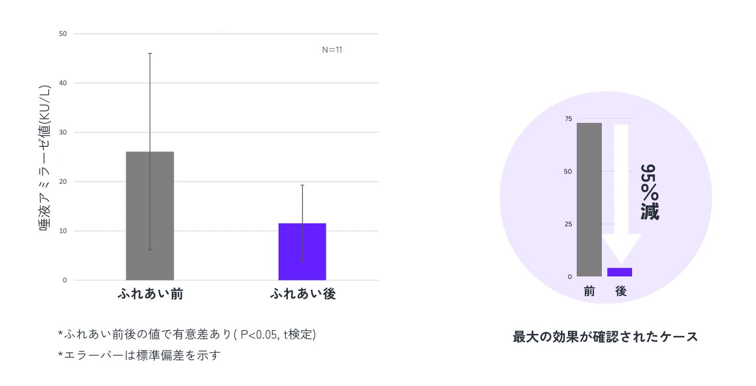 イベント参加者のうち11名に対して、保護犬の派遣活動を行う直前(犬が見えない状態)と、保護犬と十分にふれあった後で、唾液アミラーゼ測定によるストレス値の変化を比較したところ、平均で56%、最大で95%のストレス値低下が確認できました。