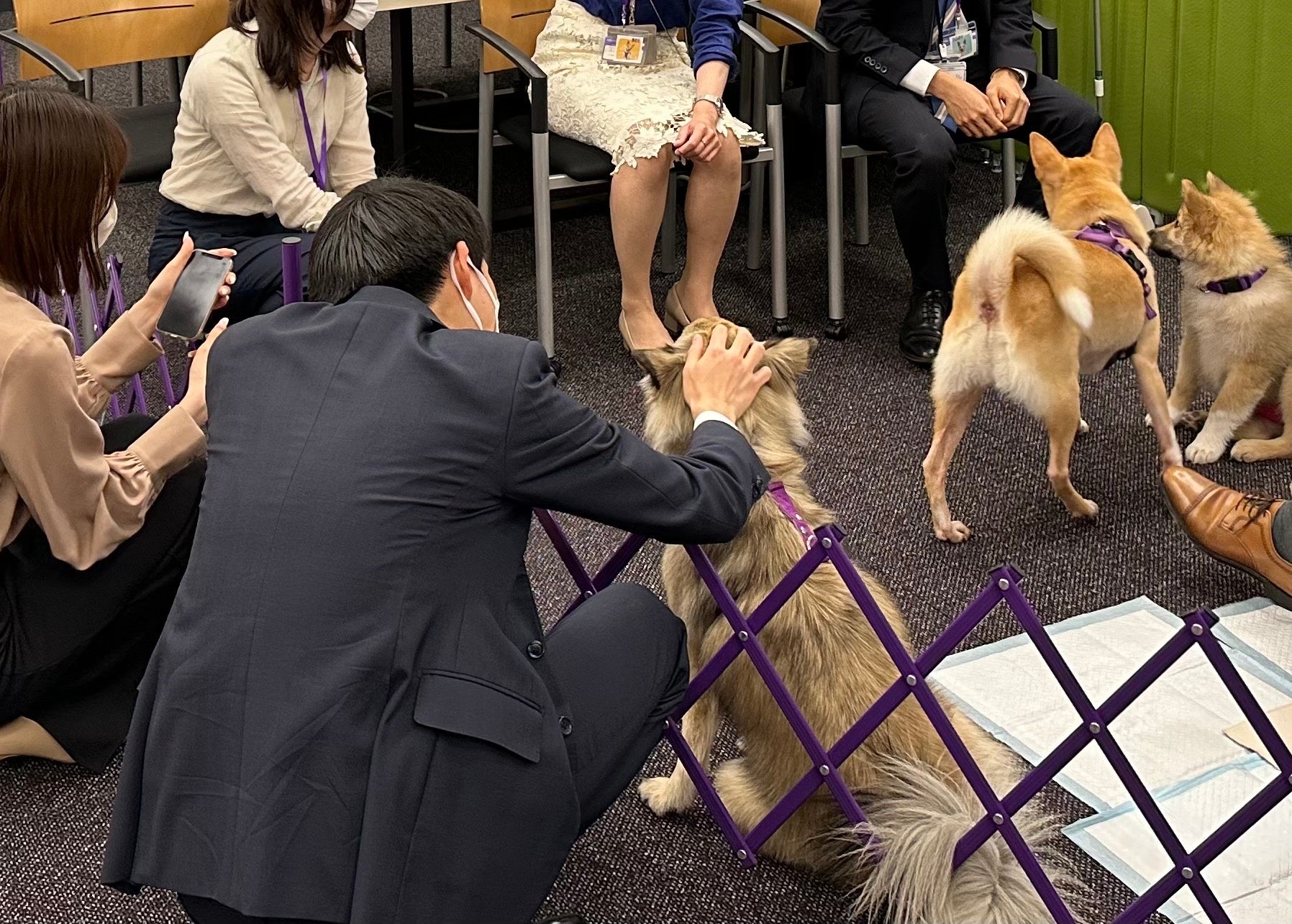 ■ イベント内容:参加者は通常通り業務を行い、自身の休憩時間やオフィス内での移動の途中でイベントスペースに立ち寄り、自由に保護犬たちとふれあう。