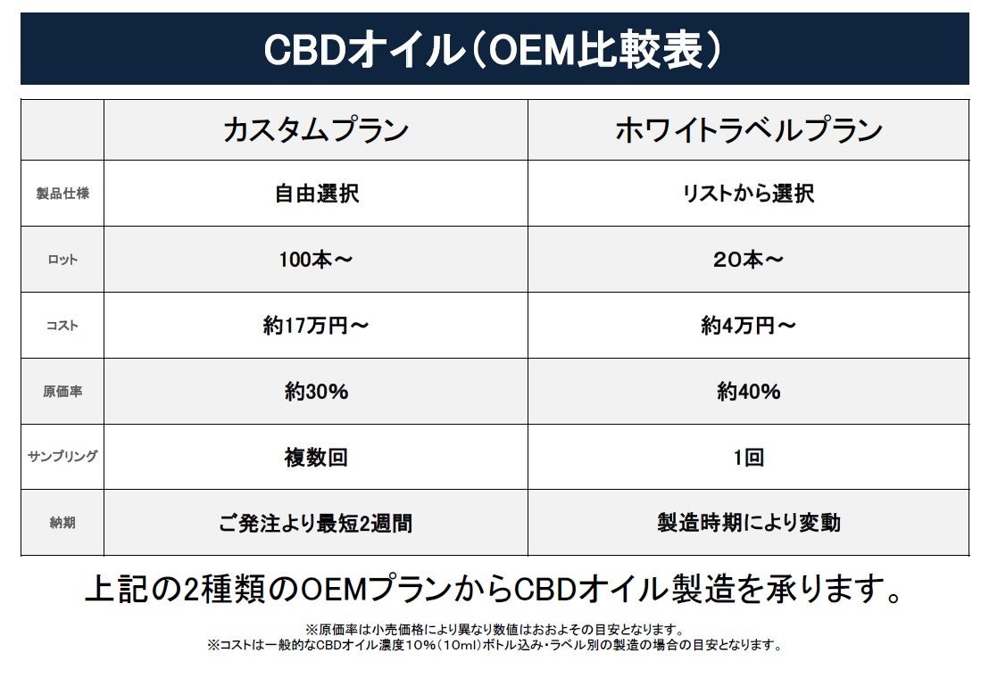 CBDは大変魅力的な市場で弊社にも様々な方からOEMについてのお問合せを頂いておりますが、細かな処方にまでこだわった完全オリジナルのCBDオイルの製造は自社工場完備の弊社でも最低でも100本からと、新規CBD事業参入を考える事業者の方には費用的にも負担が大きく、参入を断念する事業者の方も多く見受けられました。