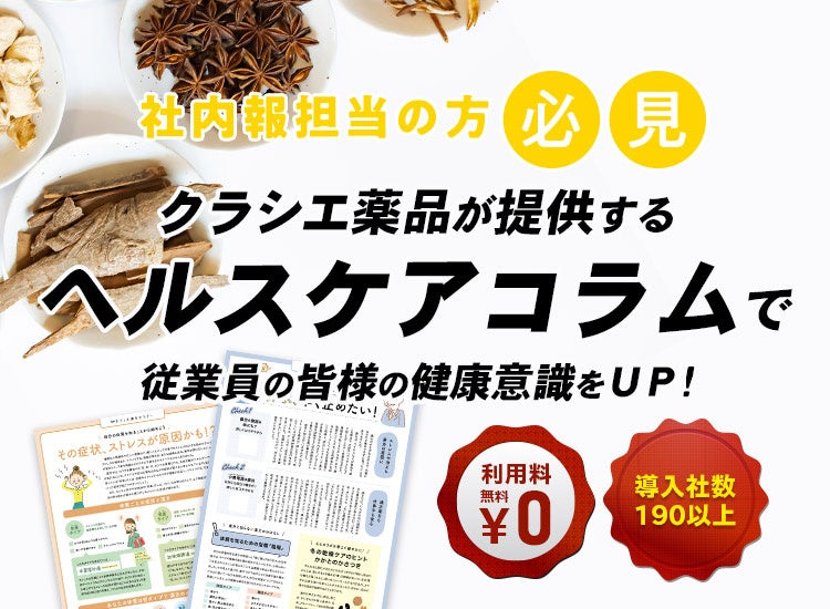 『オフィス漢方セラピー』とは、企業従業員向けのヘルスケアコラムを無償で提供しているサービスです。クラシエ薬品ならではの漢方の知識を活かした内容により、企業従業員様の健康意識の向上をサポートし、「健康経営」の一助を担うことを目的としております。