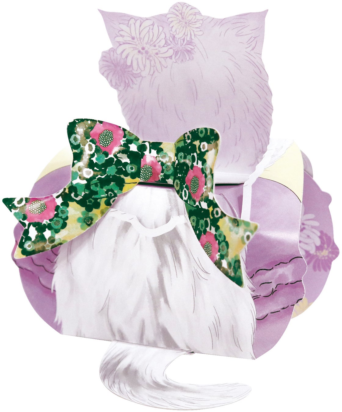 クリザンテームの花冠を纏い、マカロンから顔を出すジプシーとヌネットが愛らしい、立体型の化粧箱に詰め合わせたマカロンギフトです。背中のリボンは、PAUL & JOE 2023秋冬コレクションからセレクトした柄をデザインしました。