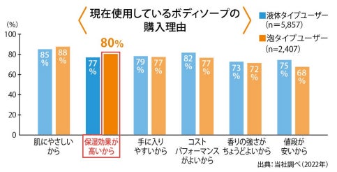 泡タイプのボディソープ市場は、「泡でやさしく洗う」意識の高まりにより拡大を続けています(2023年当社調べ)。また、当社調査によると、泡タイプのボディソープ購入者は、「肌へのやさしさ」に次ぎ、「保湿力の高さ」を求めていることが分かりました。