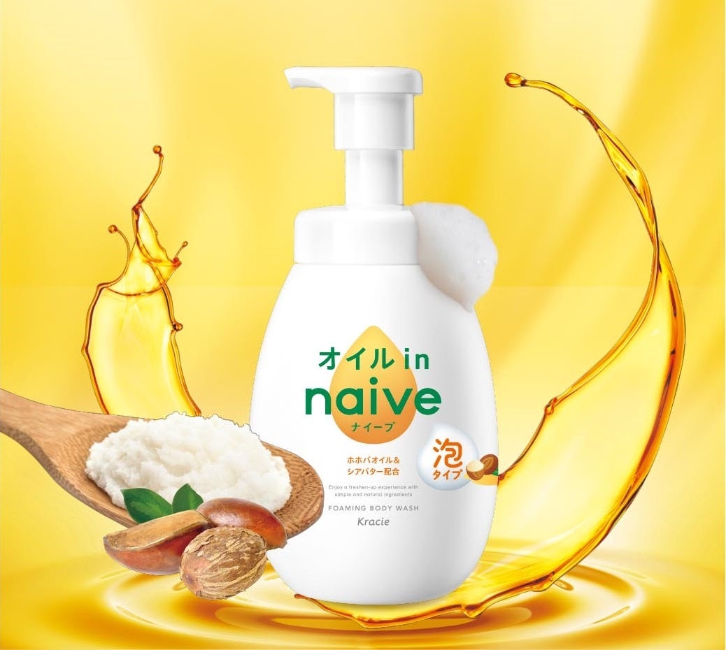 今回、「保湿力の高さ」を求めるニーズに応えて、お風呂上がりもしっとり肌続く「ナイーブ 泡で出てくるボディソープ(オイルイン)」をラインアップに加えます。保湿成分として「ホホバオイル&シアバター」を、整肌成分として「ザクロ花エキス&グリセリン」を配合。1プッシュでたっぷり出てくるやさしい泡で、子どもから大人まで乾燥しがちな肌もうるおいを守って洗い、しっとり素肌へ導きます。