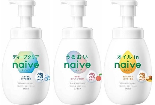 洗う成分100%植物生まれの「ナイーブ 泡で出てくるボディソープ」は、みずみずしくうるおうなめらか素肌へ導く「うるおいタイプ」と、汗・皮脂によるニオイ汚れをオフしサッパリ洗いあげる「ディープクリア」をラインアップしています。