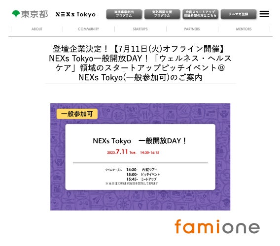 本イベントは7月11日の15時から16時に、大手町にあるNEXs Tokyoの施設にてオフラインで開催され、施設の見学などを行うことができます。7月のテーマは、「ウェルネス・ヘルスケア」となっており、ファミワンを含む現役スタートアップ会員2社とアルムナイ会員2社によるピッチイベントを実施します。充実した毎日を過ごすため、心と身体の豊かさの向上をサポートする事業へ日々取り組むスタートアップが登壇します。
