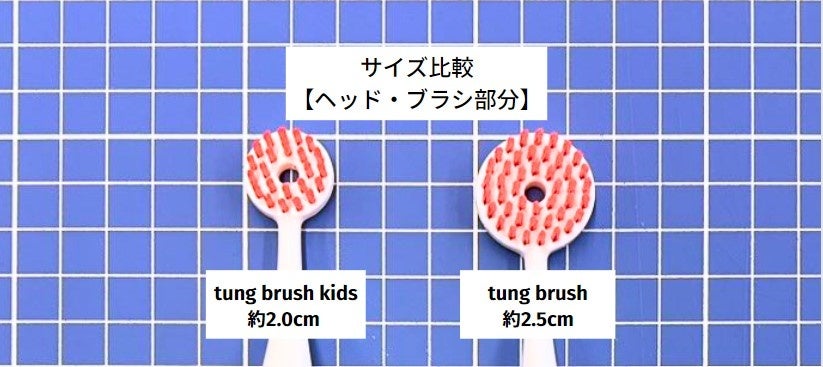 お子さまのお口に合わせデザインされた小ぶりな円形ヘッドブラシは、舌全体を容易にブラッシング出来るようになっています。通常のタンブラシよりハンドル部分は3cmほど短く(通常19cm→キッズ16cm)、ブラシ部分も