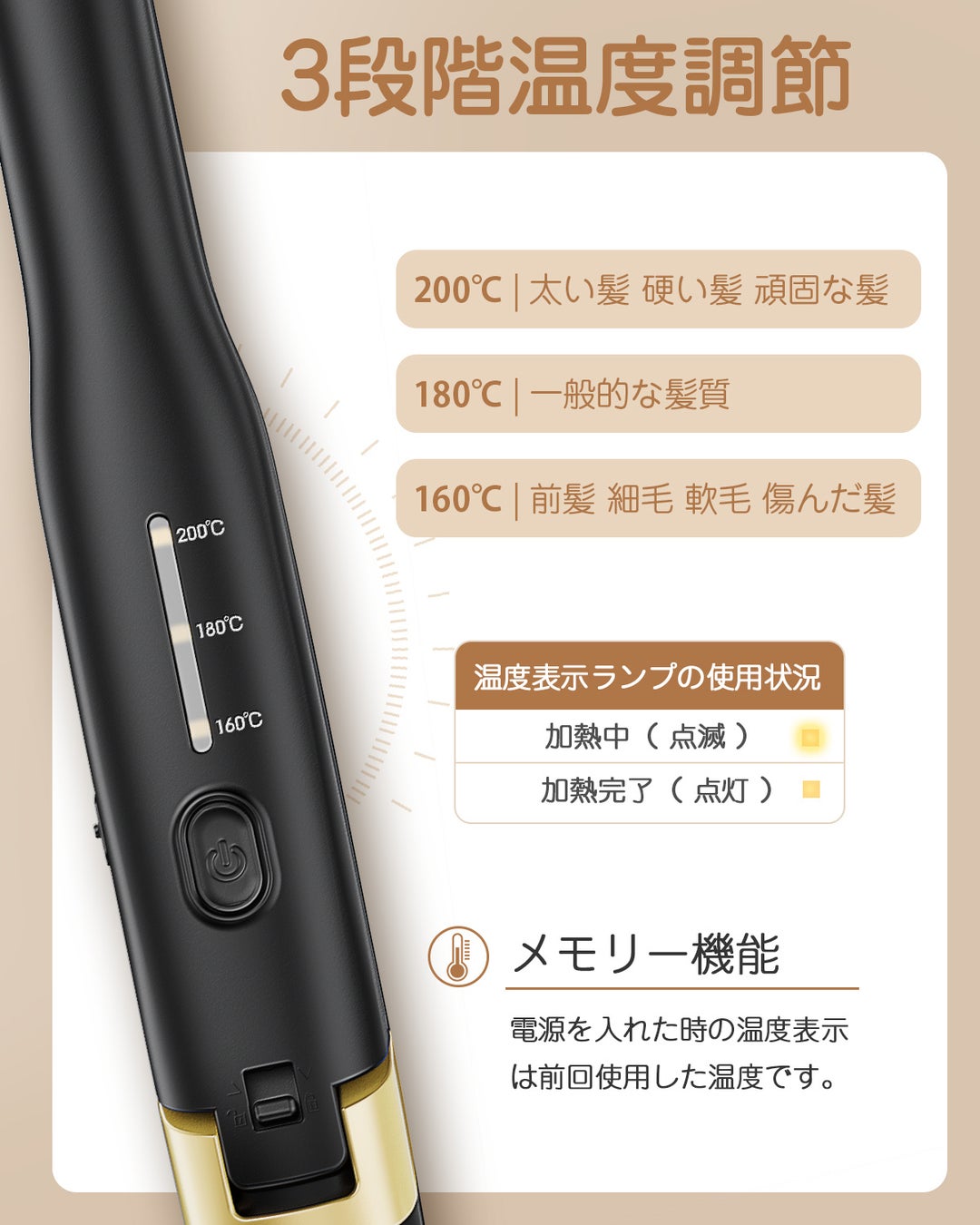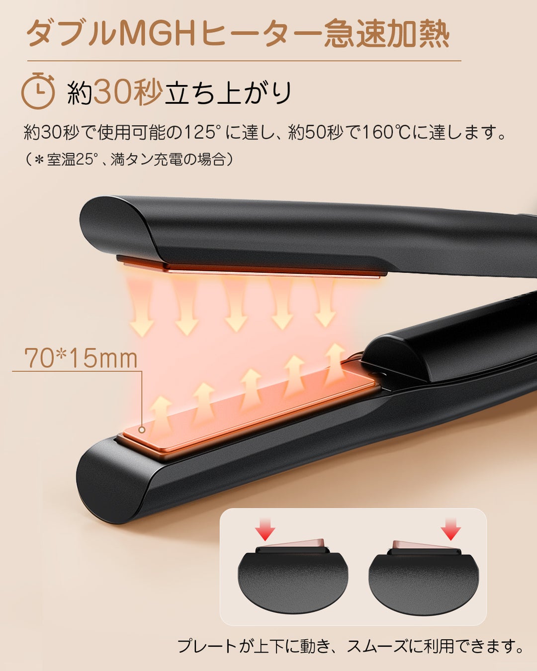 充電式ヘアアイロンはダブルMGHヒーターを搭載し、約50秒で160℃に達します。温度ボタンを押して、適当な温度に設定すると、温度表示が点滅し、加熱がスタートします。設定温度に達すると、温度表示が点灯します。持ち運びヘアアイロンはメモリー機能が搭載されていますので、次回は温度再設定の手間がいりません。