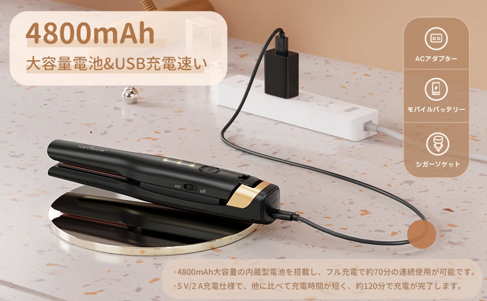 2、5 V/2 A充電仕様で、他に比べて充電時間が短く、約120分で充電が完了します。