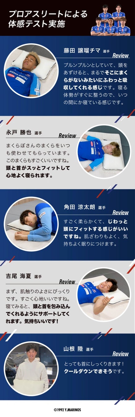 たくさんの皆さまから応援をいただいて好評発売中のこちらの枕ですが、まくらぼが公式睡眠アドバイザーを務める横浜F・マリノスの選手にも実際に体感していただきました。