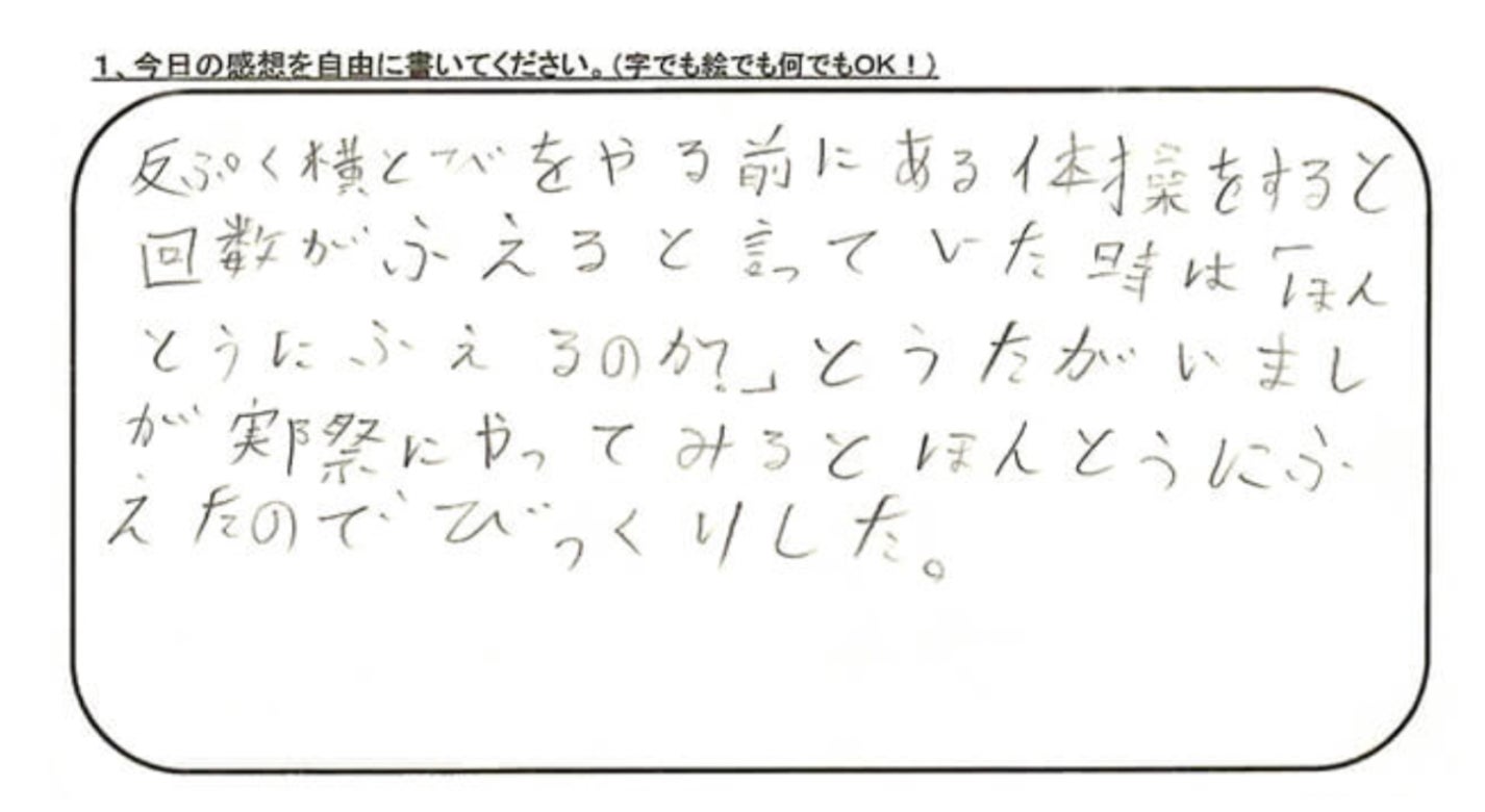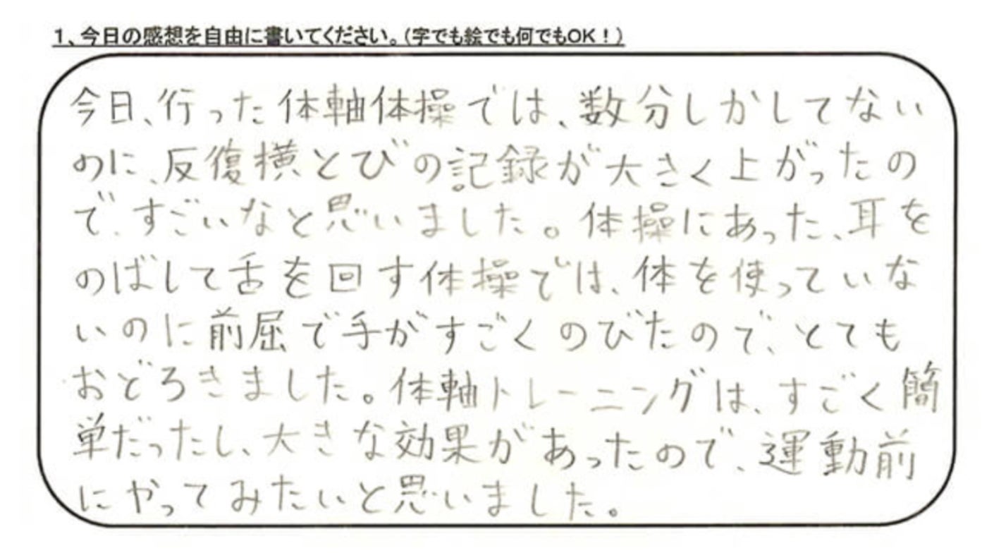 「体軸スクール」で子どもたちに提供する運動プログラムは、「即効性」があることが特徴です。運動が苦手な子どもでも楽しく実践できる動作で身体能力が向上するため、自己肯定感ややる気のアップにもつながります。