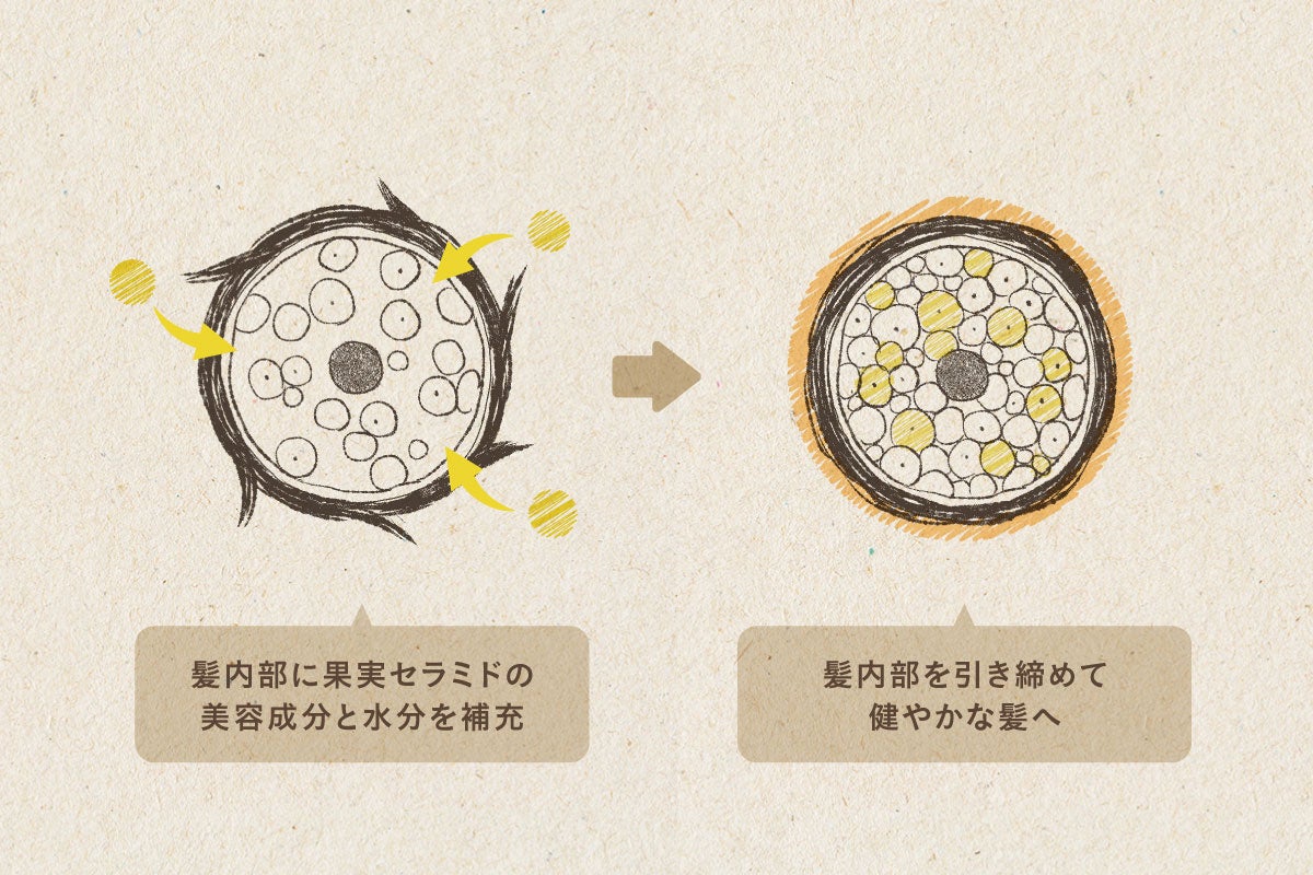 潤いが抜け出た髪内部の補修には、マンダリンオレンジとゆずの2つの果実セラミドが水分と美容成分を補充し、髪内部を引き締めます。