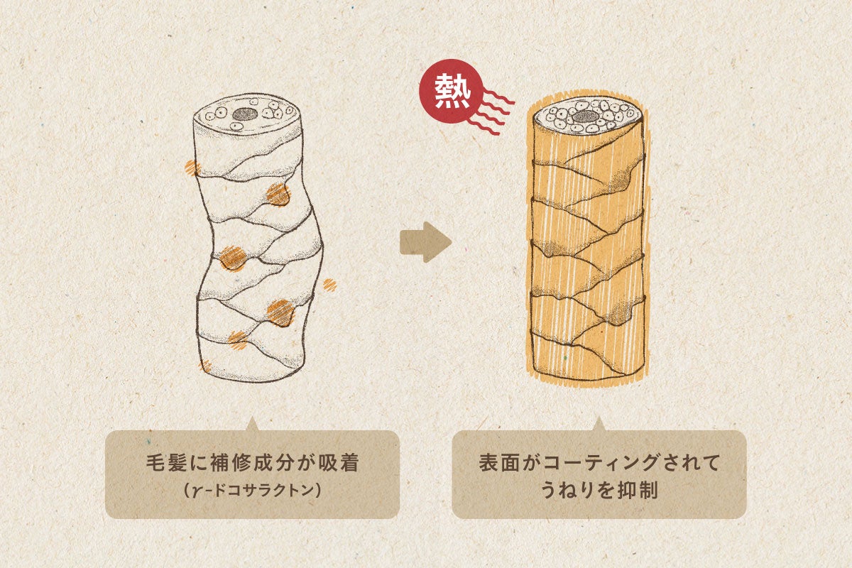 熱を加えると、ans.の補修成分が毛髪成分と結合して髪の表面に吸着コーティング。髪を洗っても落ちにくく、補修効果が続きます。