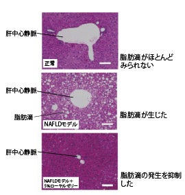 ○酵素分解処理したローヤルゼリーはNAFLDモデルマウスの腸内細菌叢の乱れ(ディスバイオーシス) を改善し、NAFLD症状を予防 (肝臓の脂肪滴が減少(右図)、脂質合成遺伝子・炎症性遺伝子・線維化遺伝子の発現量が減少) した。