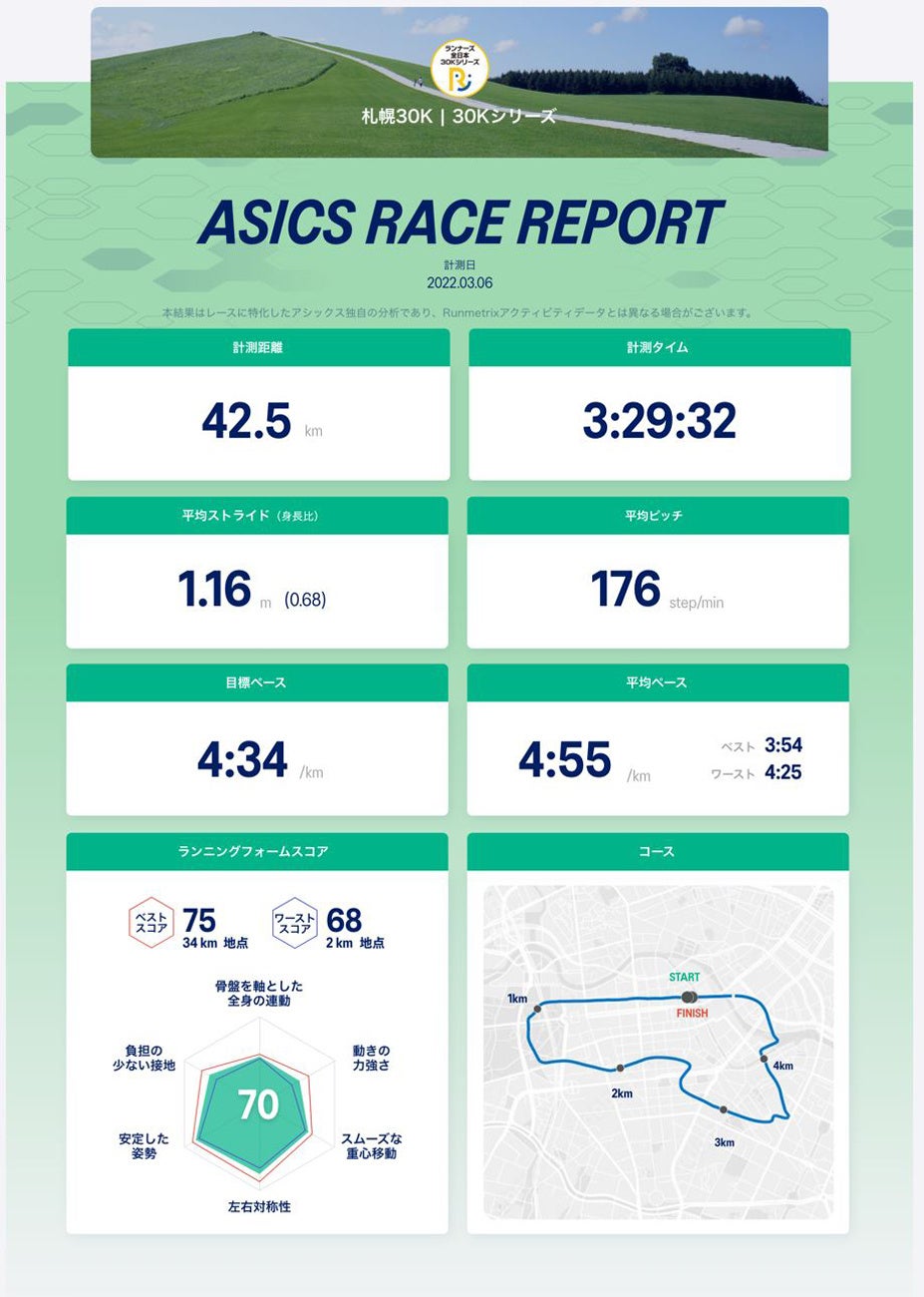 「ASICS RACE REPORT」をランニングイベントで参加者全員に提供するのは初の試みとなります。脚づくりやレース感覚を養うなどトレーニング要素を備えた「30Kシリーズ」で、レースを振り返る自分だけのレポートという新しい体験を提供することで、初レースに臨むビギナーから自己記録更新を目指すシリアスランナーまで、一人ひとりの目標達成と、より充実したランニングライフを後押しします。