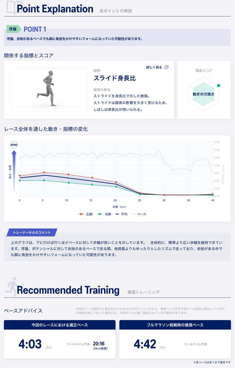 「ASICS RACE REPORT」は、一般的なレース・ランニングイベントで提供されている完走証や、ゴールタイム・ラップタイムのみが記載された記録証とは異なり、レース全体を通じたランニングフォームの変化を詳細に分析したフィードバックを受けられる点が特徴で、カシオ計算機と共同開発したランナー向けパーソナルコーチングサービス「Runmetrix(ランメトリックス)」※1で使用するモーションセンサーを用いてデータを収集します。アシックススポーツ工学研究所が開発した独自のアルゴリズムにより、レース序盤・中盤・終盤の各時点におけるランニングフォームの分析評価に加え、レース全体を通じたペースの変化からレースにおけるペース配分を振り返ることができます。さらに、走り方の傾向やペース配分に基づいたトレーニングの紹介など、次のレースに向けたステップアップをサポートします。