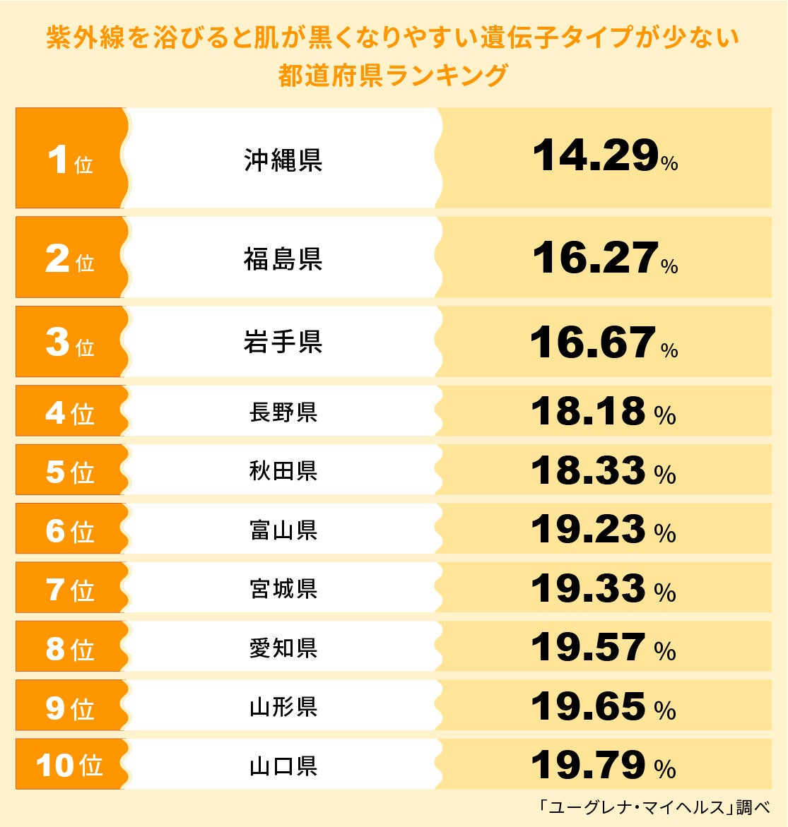 一方、今回のランキングで1位だった沖縄県は紫外線が強い地域にもかかわらず、メラニンを作る力が弱い、紫外線に過敏なタイプが多いという結果となりました。沖縄県出身の人は、紫外線対策を念入りに行った方がよいかもしれません。