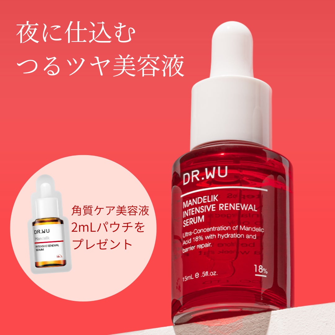 DR.WUの代名詞ともいえる、整肌成分マンデル酸を配合した角質ケア美容液「マンデリック インテンシブ 18%セラム」のサンプルパウチ(2mL)を期間中合計10,000個配布します。