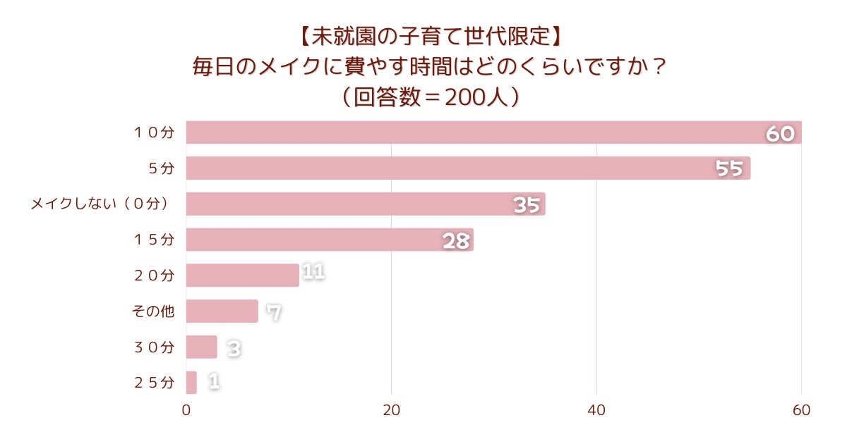 「【未就園の子育て世代限定】毎日のメイクに費やす時間はどのくらいですか?」とアンケート調査した結果、1位は『10分』でした。