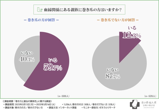「血縁関係にある親族に巻き爪の方はいますか?」と質問したところ、巻き爪の方のおよそ6割が『いる(59.7%)』と回答したのに対し、巻き爪でない方は『いる(12.3%)』と回答した方が2割に満たないという結果が出ました。