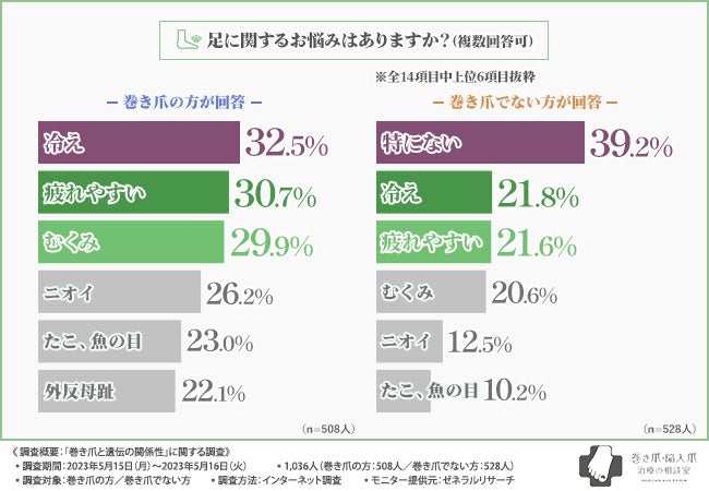 ・足に関する悩み、巻き爪の方は『冷え』、巻き爪でない方は『特になし』という結果に