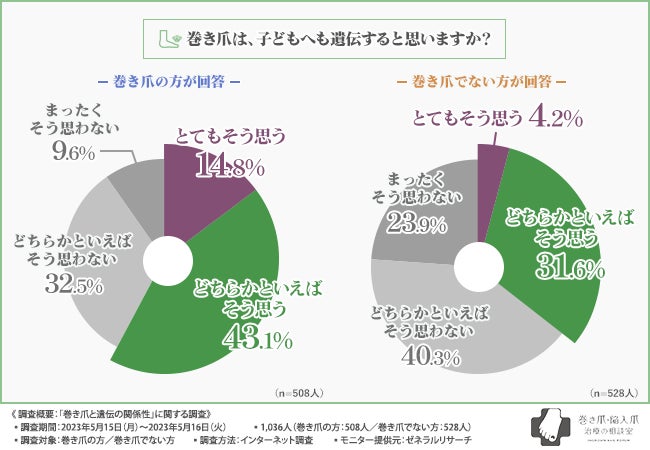 そこで、「巻き爪は、子どもへも遺伝すると思いますか?」と質問したところ、巻き爪の方と巻き爪でない方それぞれの回答結果は下記のようになりました。