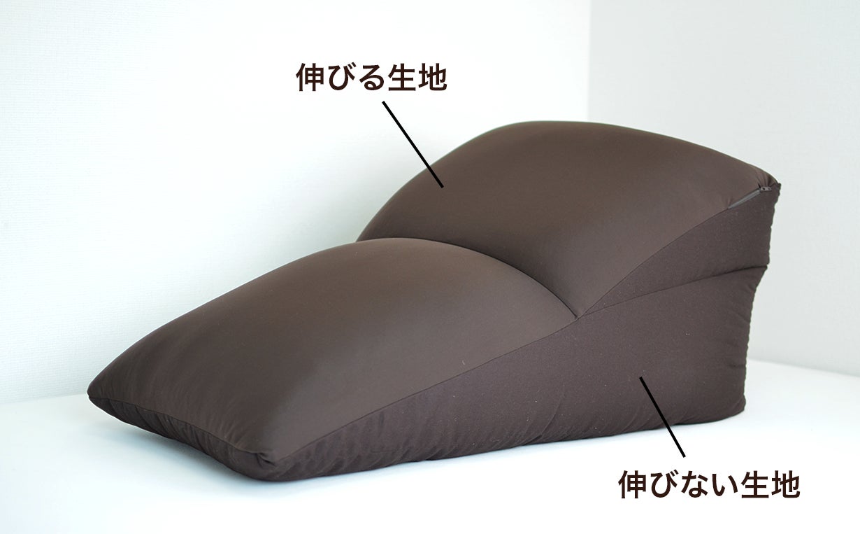 上面は「伸びる生地」で、気持ちいい寝心地を実現。逆に、側面と底面は「伸びない生地」で、しっかりとビーズの動きを制御。これによって、体重をかけてもしっかりと形状がキープされ、思い通りのよつんばい姿勢をキープします。