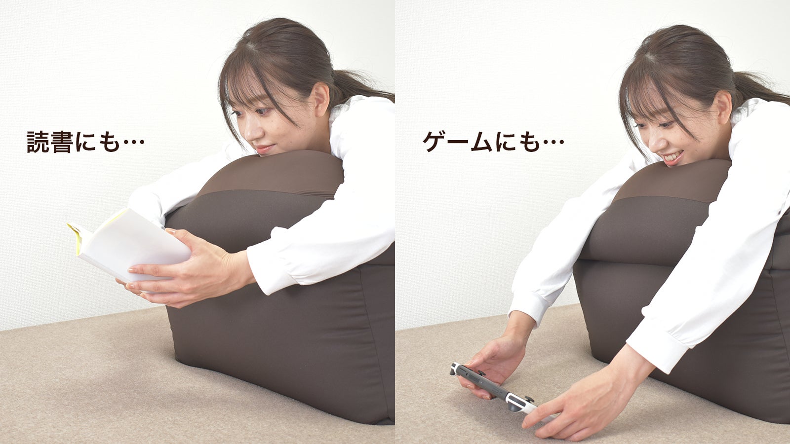 これは「毎日の座りっぱなし生活で、腰や肩や首がつらい…」という方に向けた、新発想のビーズソファ。 “うつぶせ姿勢”ではなく、カラダにやさしい“よつんばい姿勢”をベースに設計しているため、長時間の寝ながら作業もすごくラクになります。