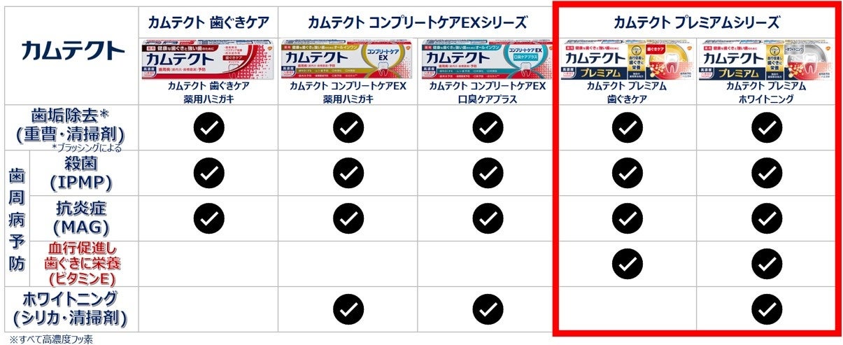 「カムテクト プレミアム」は、「カムテクト」シリーズ独自の重曹配合処方による歯垢除去パワーと、殺菌・抗炎症作用による歯周病(歯肉炎・歯槽膿漏)予防の効果に加え、日本だけのオリジナル処方である「ビタミンE」を新たに配合しました。歯垢除去後、キレイになった歯ぐきの血行を促進し、歯周組織に栄養を届けて歯周病を予防します。「カムテクト プレミアム 歯ぐきケア」は、歯ぐきの健康ケア(歯周病予防)に特化したタイプ、「カムテクト プレミアム ホワイトニング」は、歯周病予防に加え、シリカ(含水ケイ酸:清掃剤)配合でホワイトニングに特化したタイプとなっています。
