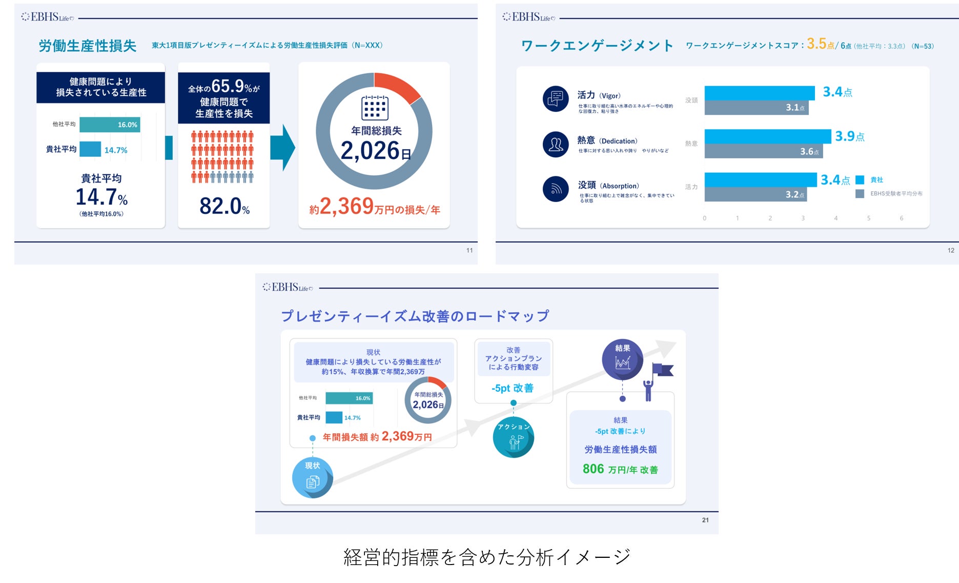 また、健康状態悪化による労働生産性損失額(プレゼンティーイズム)の表示や、ワークエンゲージメントの表示など、今後の経営に求められる指標を盛り込んでおり、健康状態と経営状況を紐づけ、経営を推進する健康施策の実現をサポートします。これらの指標は自社のスコアだけでなく他社平均との比較も行えるため、相対的な自社の立ち位置も把握可能です。