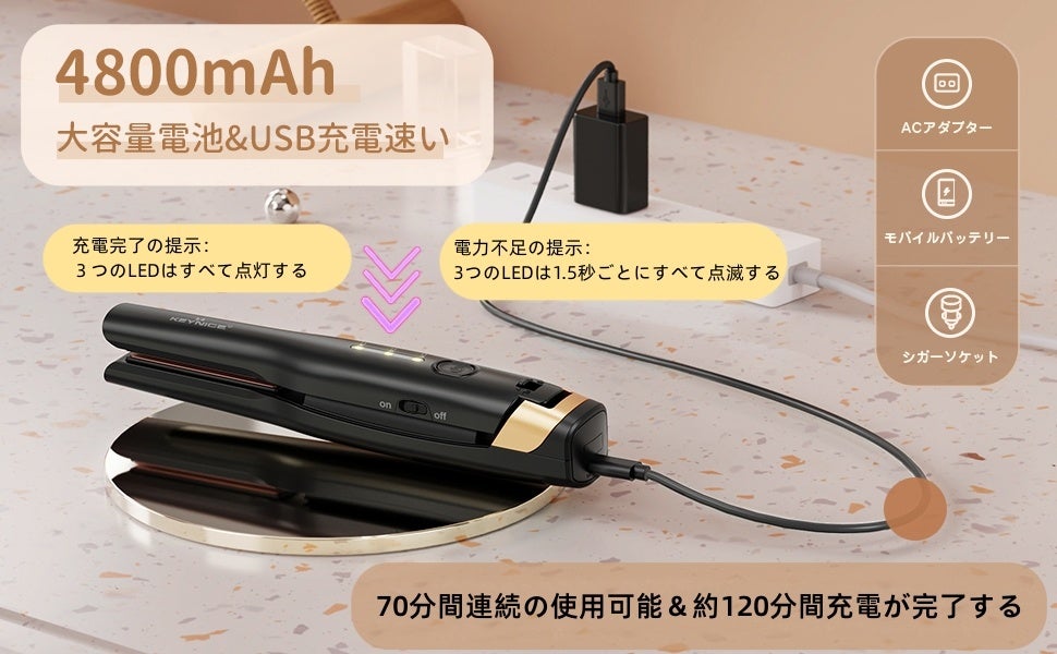 本ストレートヘアアイロンは4800mAh大容量の内蔵型電池を搭載し、フル充電で160℃の場合は70分間連続使用が可能です。5 V/2 A(Type-C USB)充電仕様で、他に比べて充電時間が短く、約120分で充電が完了します。