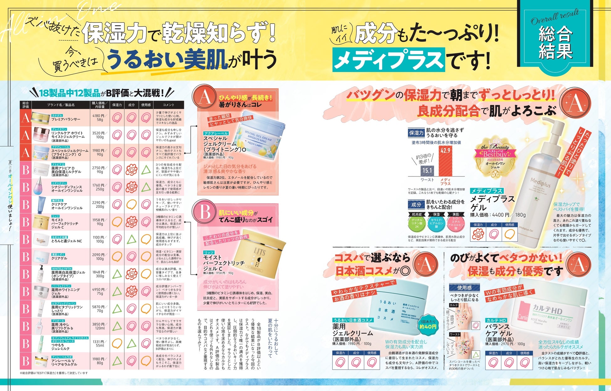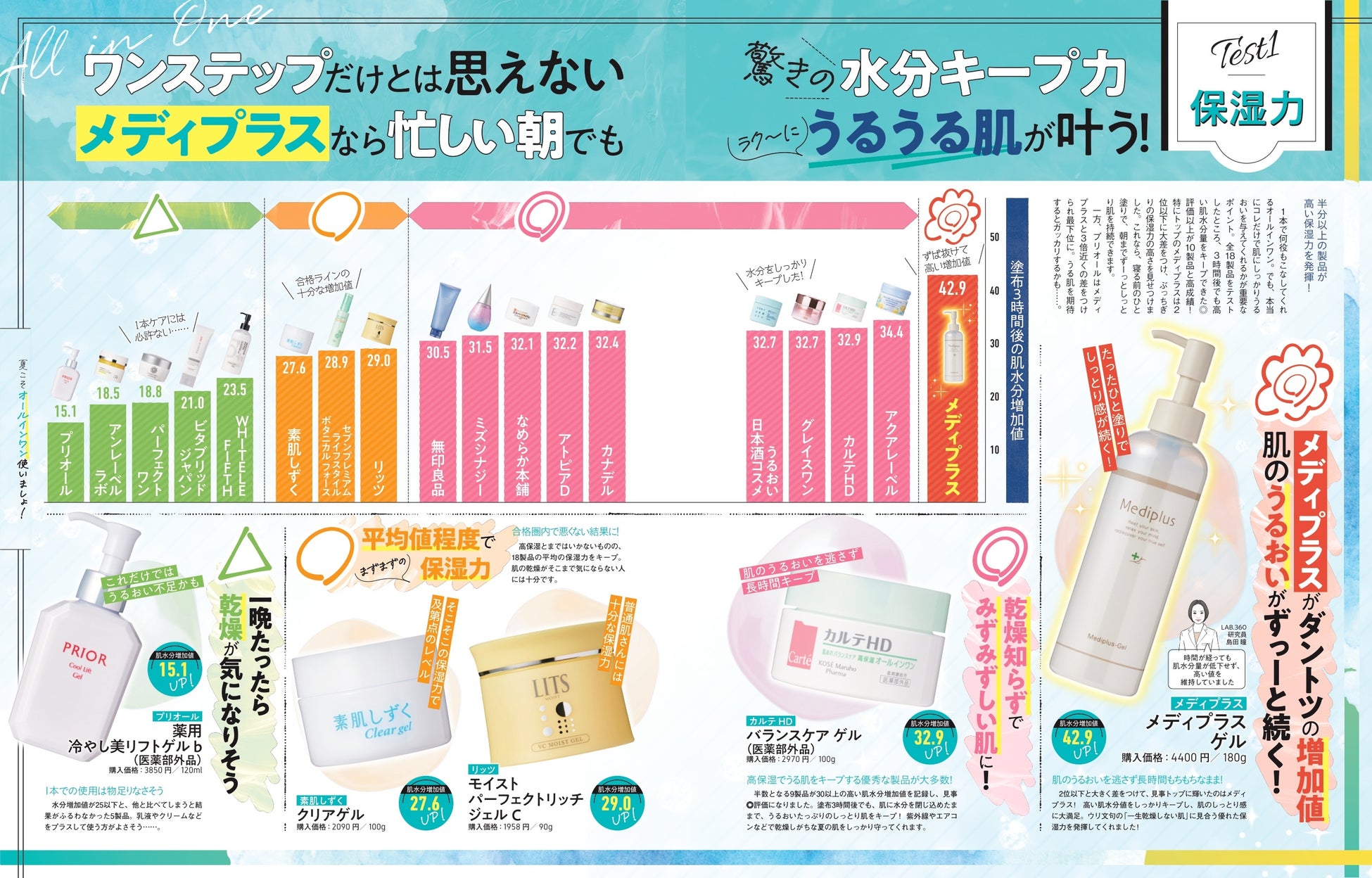 「ワンステップだけとは思えない驚きの水分キープ力」「ぶっちぎりの保湿力の高さ」「ズバ抜けた保湿力で乾燥知らず!肌にイイ成分もたっぷり!今、買うべきはうるおい美肌が叶うメディプラス」(LDK the Beauty 2023年8月号より引用)として、優れた肌水分増加値、美肌効果のある成分配合、何より最大の魅力として優れた保湿力を評価していただいております。