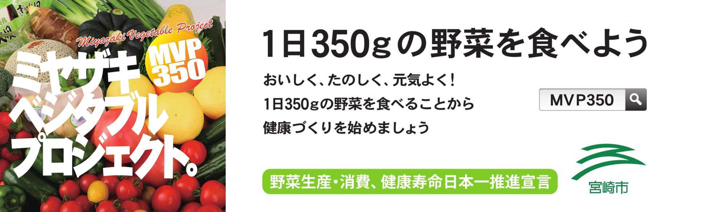 宮崎市では、成人1日あたり350gの野菜を食べることを推奨する「MVP350(ミヤザキ・ベジタブル・プロジェクト350)」に取り組み、栄養バランスのとれた食生活を促す市民運動を展開しています。