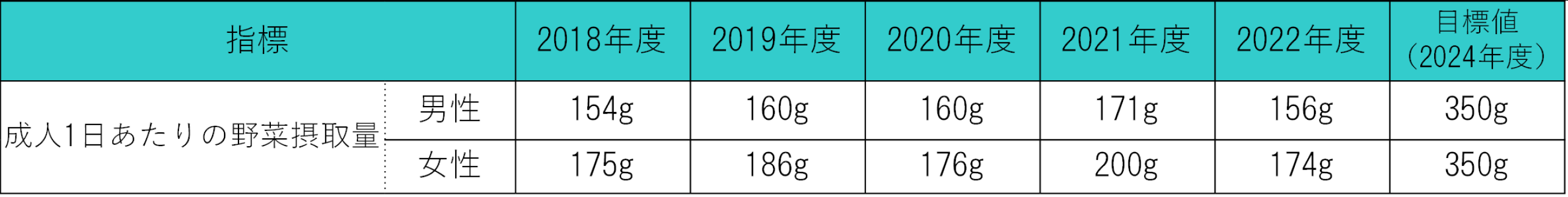 しかし、宮崎市が令和4年度に実施した調査によると、市民の野菜摂取量は、男性156g、女性174g。目標とする350gにはほど遠い結果となっており、特に20代、30代の若年層で野菜摂取量が少ない傾向にあります。