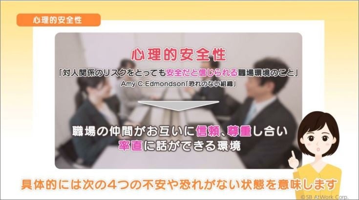 ソフトバンク株式会社の子会社で人事系シェアードサービスを提供するSBアットワーク株式会社(本社:東京都港区、代表取締役社長:野村 純也)は、メンタルヘルスやハラスメント対策、ヘルスケアに関する法人向け動画教材サービス「Wellness Eye Study(ウェルネスアイ スタディ)」に、心理的安全性や自身の成長と改善を促すフィードバックをテーマとした3本のコンテンツを新たに追加しました。