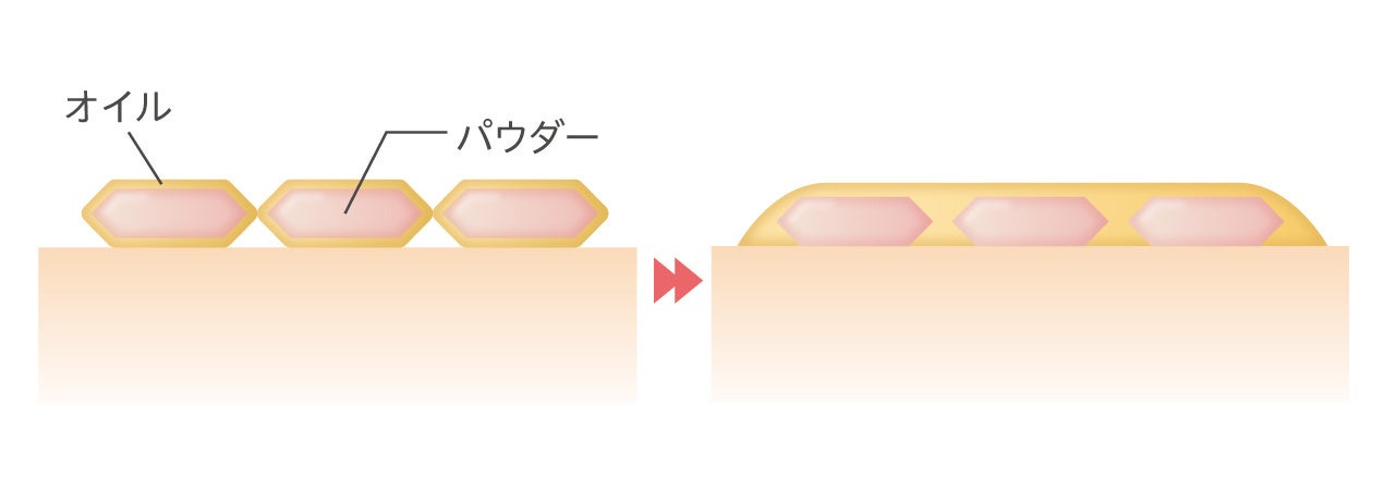 粒子の細かいパウダーが保湿オイルに包まれているため、肌馴染みが良くしっとりと保湿*3しながら密着してくれます。潤いヴェールをまとったようなツヤ感を残しつつ、余分な皮脂を吸収しメイクキープしながらテカりを防止してくれます。