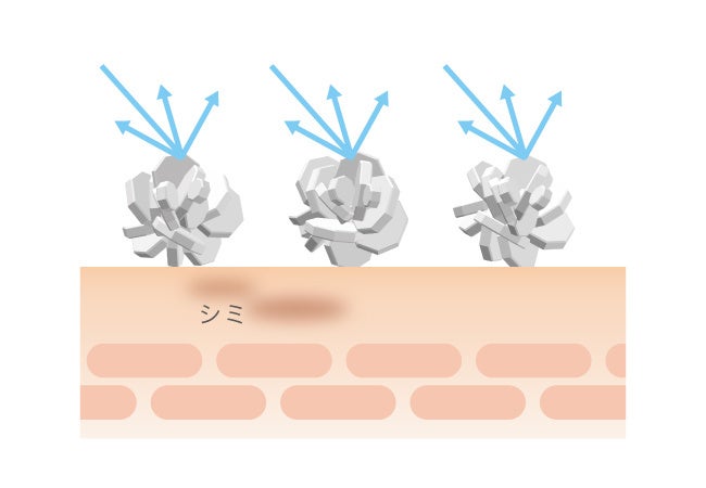 ミラーボールのように光を乱反射させるソフトフォーカス成分*2を配合し、お肌の凹凸によってできる影を見えにくくすることにより、くすみ・シミ・シワ・毛穴をぼかし目立たなくします。