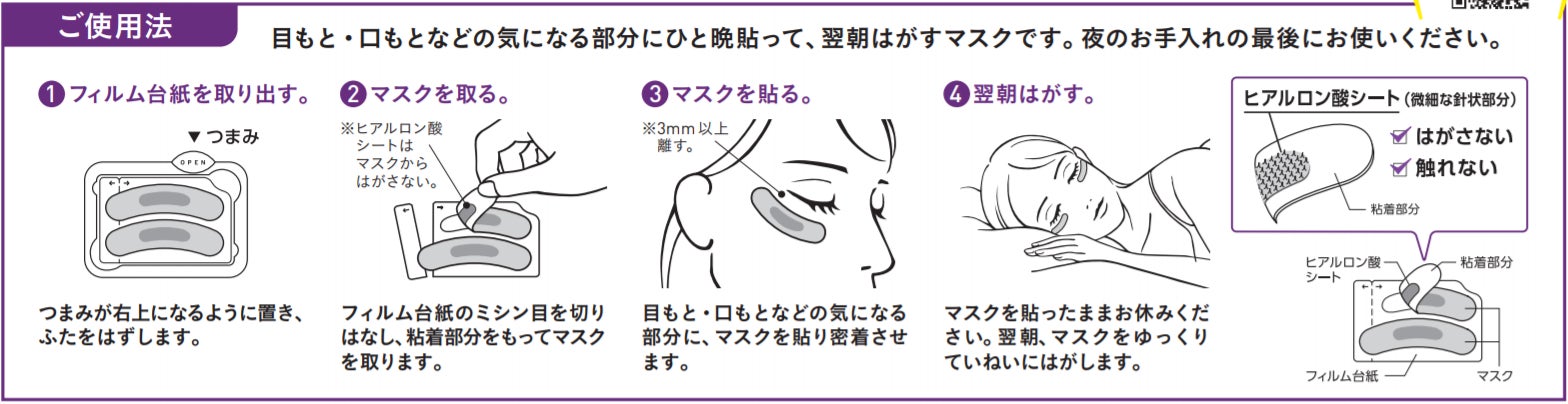 極小針が気になるところまでチクッと密着。角層最深部までうるおいをダイレクト注入。寝ている間もはがれずケアします。
